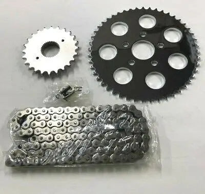 Chain drive kit for Harley Davidson touring models six speed transmissions. Comes with front pulley, rear dished sprocket, 530 o-ring chain, and spacer for rear pulley. Close to stock gear ratio. Hardware not included.
