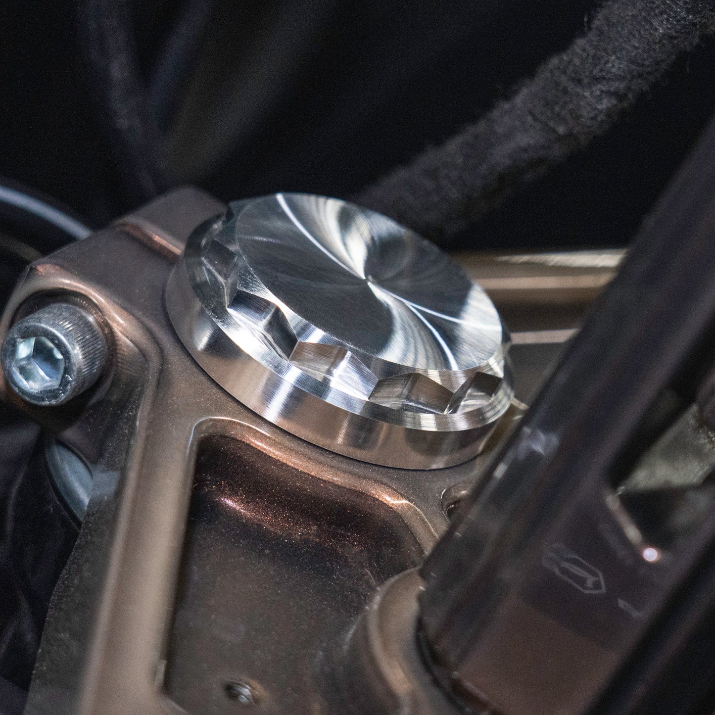 This Hofmann Designs 12 Point Fork Stem Nut Cap is designed specifically for use with 2014 and newer 49mm OEM triple trees, allowing for easy removal of nacelle/gauge housings. It is also compatible with most aftermarket top triple trees where the fork stem nut is exposed above the triple tree. Choose between a sleek black or elegant machine finish. Mounting hardware is included for convenience.